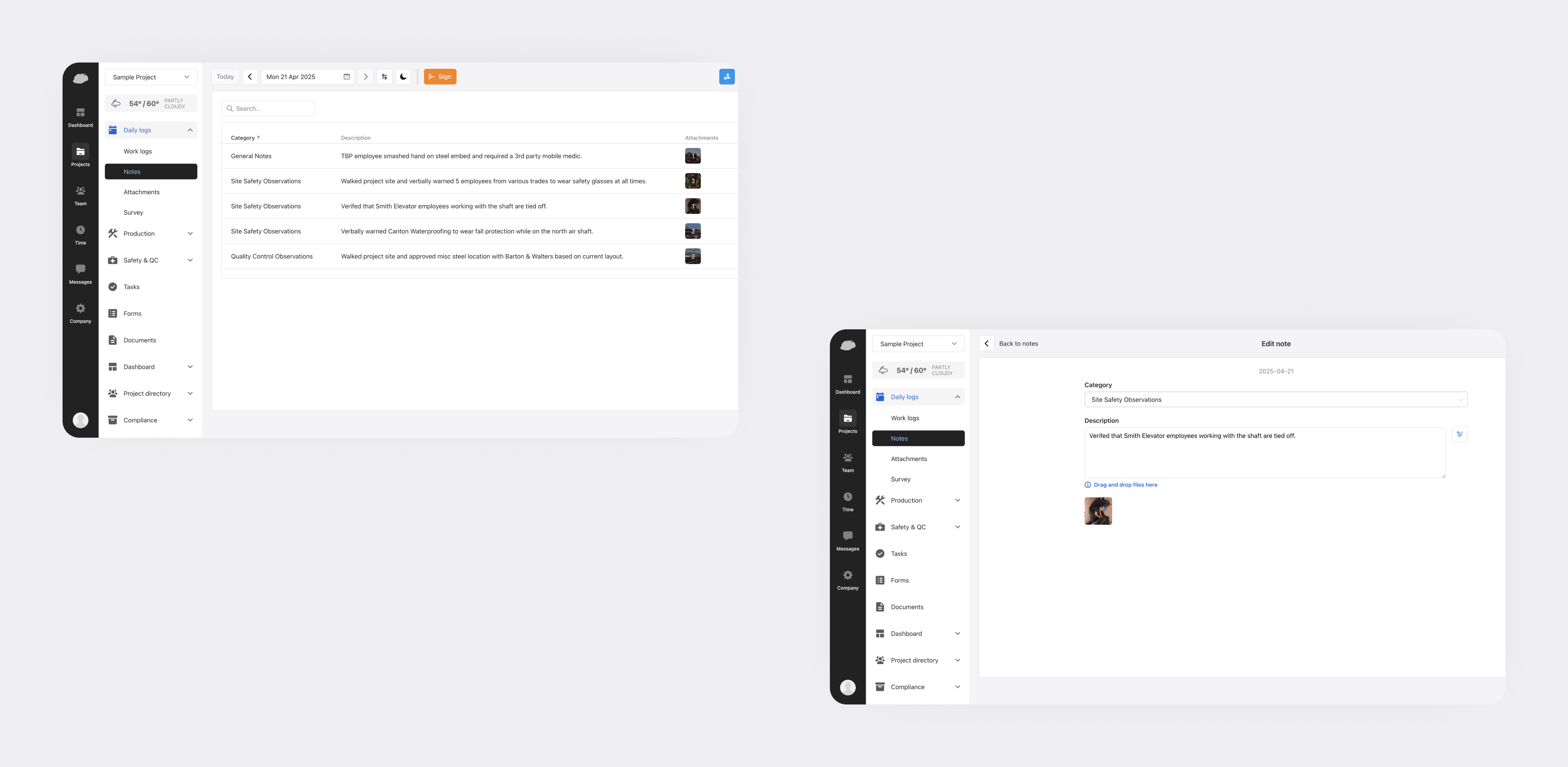 We provided full cycle mobile app development and support implementing robust functionality: daily logs and reporting, time tracking and estimates, photo and video capture, photo, video, and attachments upload, as well as developed custom forms.